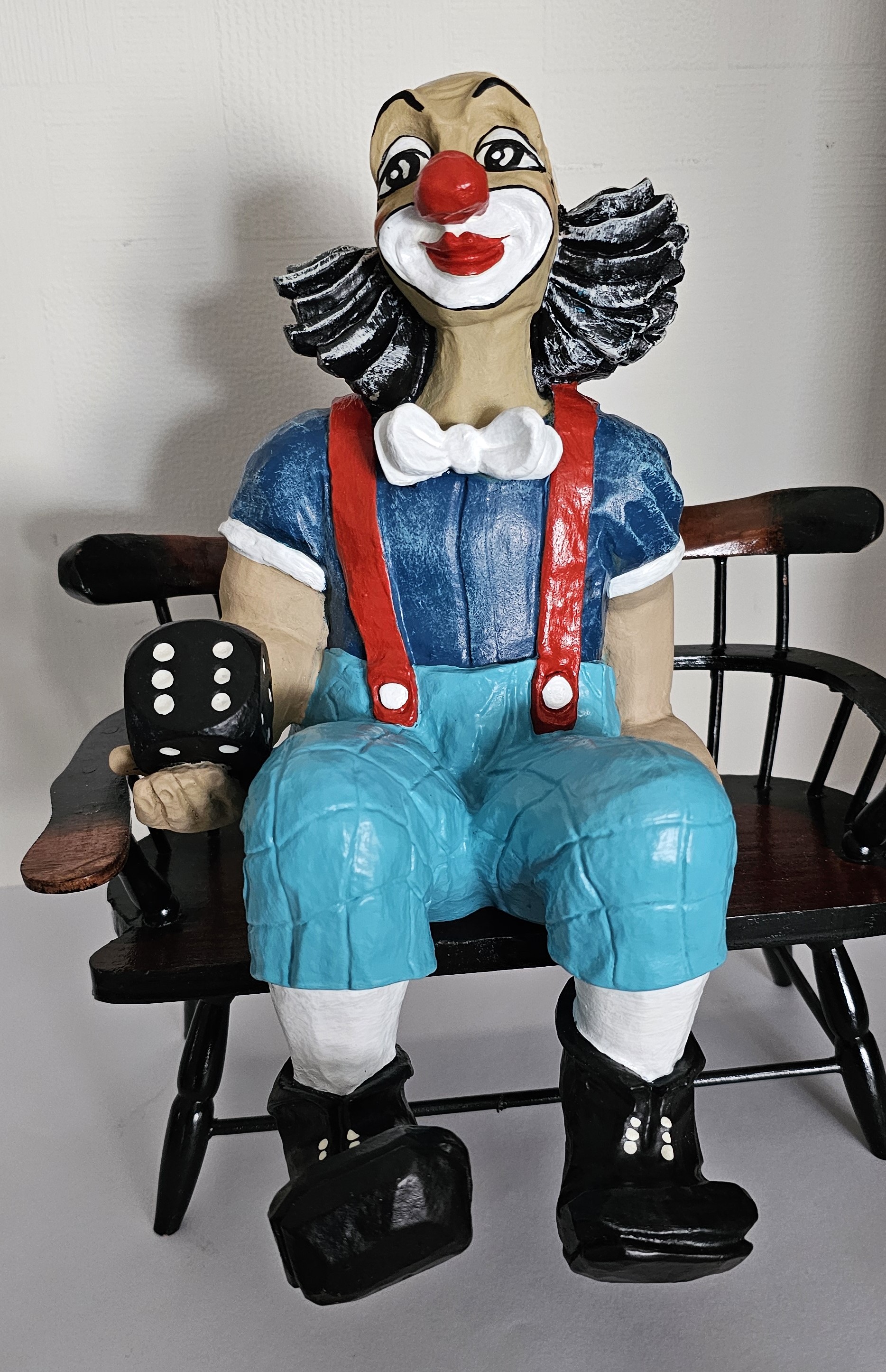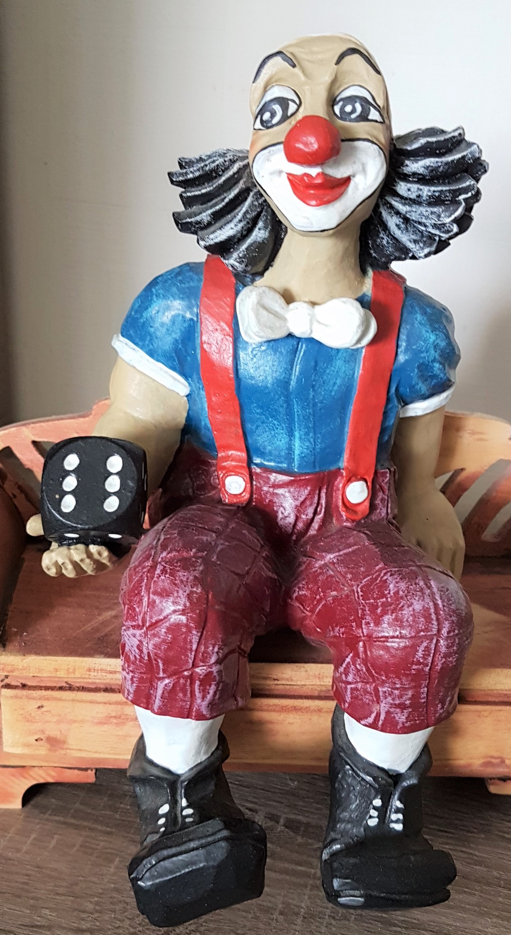 Clown, sitzend mit Zerwanz; Knie überschlagen